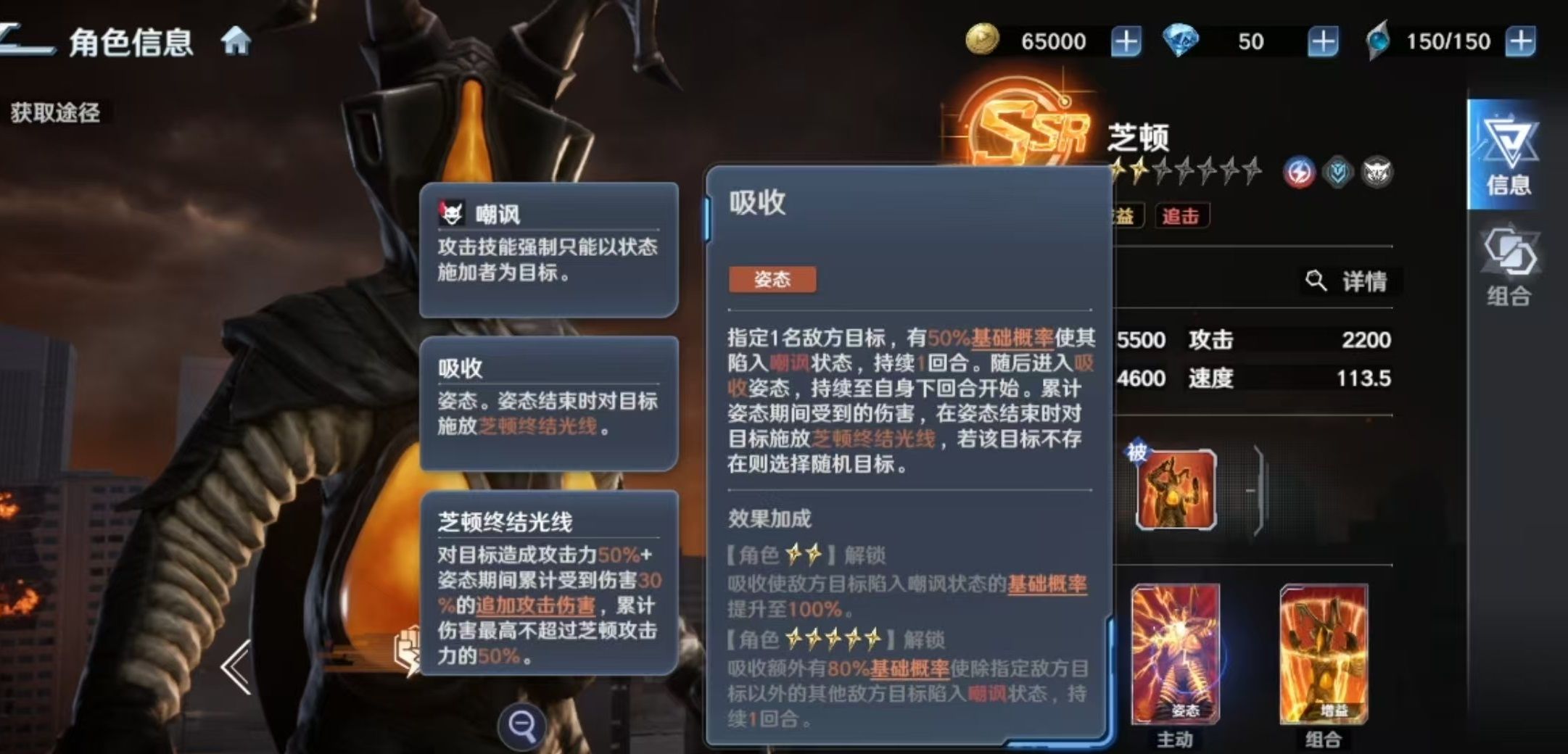 芝顿外形极具辨识度,以巨型甲虫为设计蓝本,兼具压迫感与原作神韵。作为稀有度为SSR的前排单位,其核心价值体现在三层功能性标签:嘲讽、护盾、减益效果,配合高生存能力,在队伍中承担控场与节奏压制双重职能。