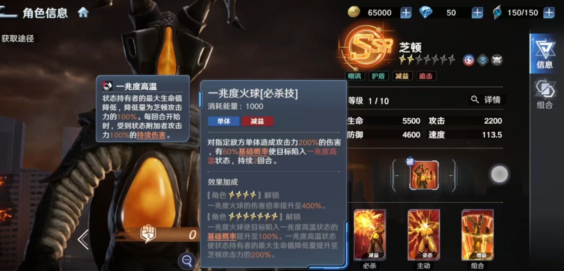 主动技“1兆度高温”为单体高威胁必杀技:对指定敌方单位造成伤害,并有概率施加持续两回合的“1兆度高温”状态。处于该状态的目标,最大生命值将被永久削减,且每回合初额外承受一次基于削减量的比例伤害。结合被动技的持续掉血效果,芝顿可构建多层复合流血体系,实现稳定中长期压制输出。