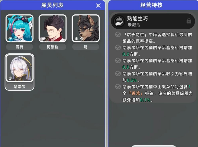 刚把店铺开起来,第一件事就是要把基础功能给解锁了。进到管理界面之后,右边有个技能树的按钮,点进去能看到不少可以激活的东西。这里面小编觉得最值得先点的,就是哈索尔那个熟能生巧的技能。这技能有个好处,就是你每做一次咖啡或者菜品,都会累积一点被动加成,时间长了员工做出来的东西售价就能往上涨。至于招财猫那个功能,虽然看起来挺吸引人,但其实需要店铺等级达到3级,还得有10次五星好评才能开,前期资源本来就紧张,没必要急着解锁。