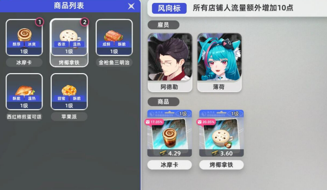 等店铺升到2级之后,苹果派和咖啡就可以捆绑销售了,把这两样拖到收银台的组合货架上,能明显提高连带购买率。哈索尔这个员工升到3级,就能解锁咖啡大师的分支技能,这个分支里面有个金杯萃取的技能,建议优先点满。虽然前期投入的技能点数比较多,但是效果很明显,精品咖啡的售价能提高零点四五元。