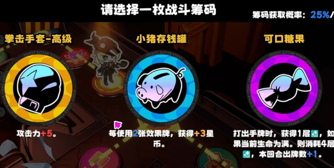 当玩家们获取到金拳套后,就能在左下角的筹码界面中看到它,它可以与多种不同的战斗筹码进行搭配,且所加的攻击力也与其他加攻战斗筹码叠加,玩家们若是身上还有可加攻的卡牌,可在战斗前的卡牌使用阶段直接用,配合金拳套等加攻战斗筹码把攻击力叠上去,只要自己投掷出的点数不是太小,就能很轻松地将攻击撑得四五十,即便是boss类的敌人,在面对玩家如此高攻击的情况下也会伤筋动骨,很难进行抵挡,而那些血量更低的精英怪更加不是玩家的一击之敌。