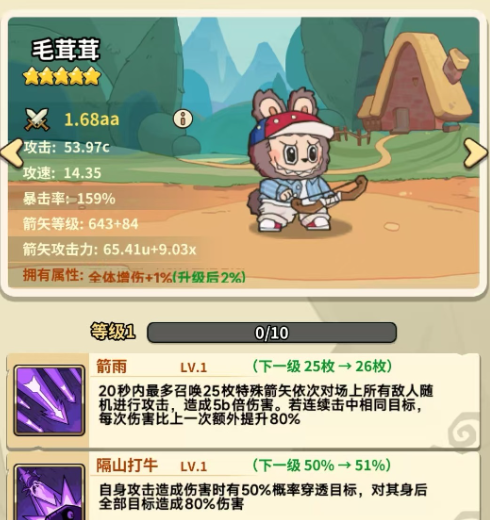 《五芒星战记》中的五星角色拉布布并非弱势。其核心技能“箭雨”在20秒内可召唤多枚箭矢连续攻击,同一目标伤害会递增。他虽不吃部分常规增益(如虎女、鳄鱼被动),但能有效享受闪电、刺猬及特定城墙皮肤的加成。