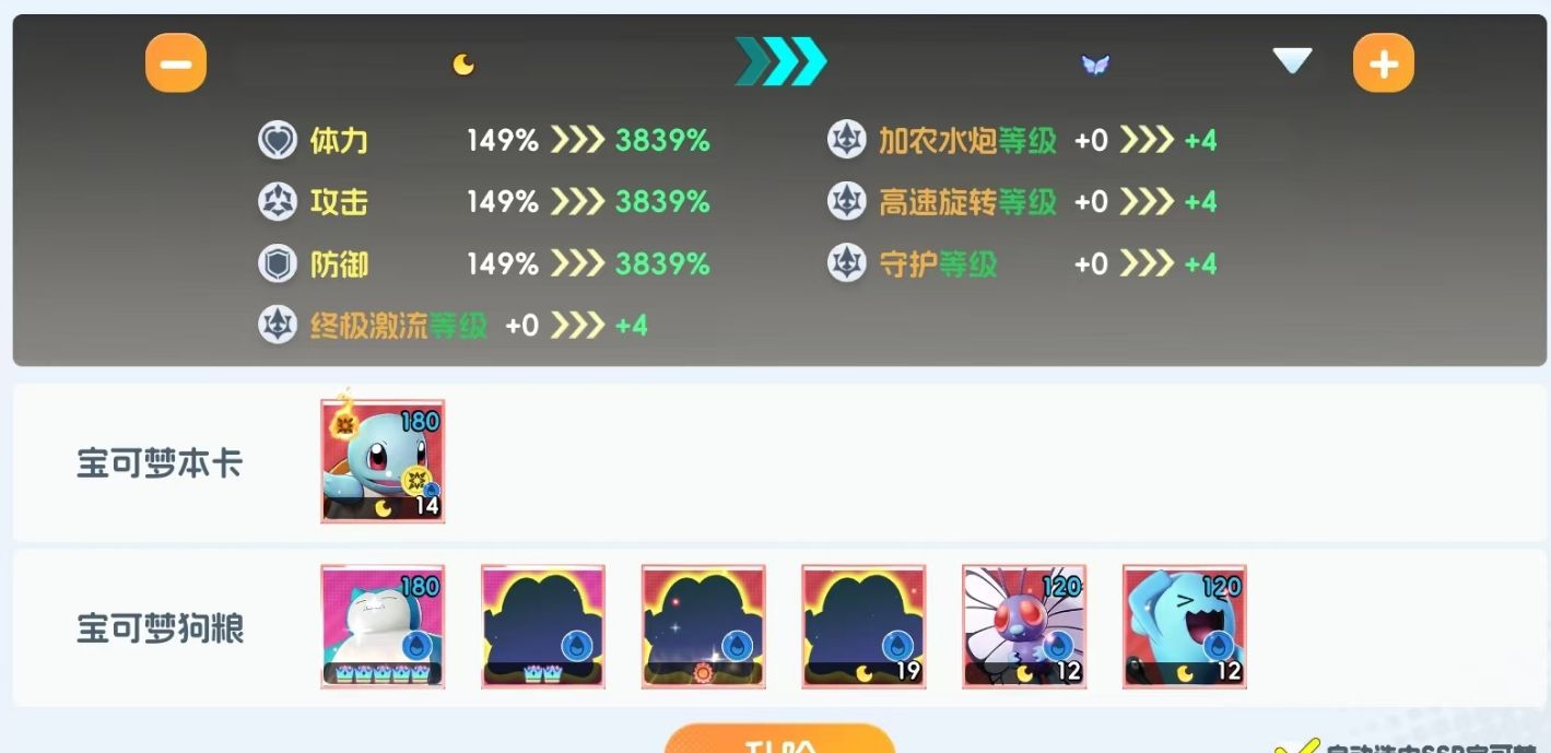 其一自然是帮助宝可梦们升阶,游戏规定MEGA进化需要宝可梦至少从月亮1阶升级至天使1阶,共计需要升阶16次,才能满足进行MEGA进化的前提条件。而要达成这一目标,玩家们需要准备14个同样的月亮1阶宝可梦作为升阶素材,同时要准备一个皇冠5阶宝可梦、2个皇冠1阶宝可梦、1个太阳1阶宝可梦和33个月亮1阶的宝可梦作为升阶时所需消耗掉的狗粮,且需要升阶的宝可梦和狗粮宝可梦必须为同一系,成本极高。