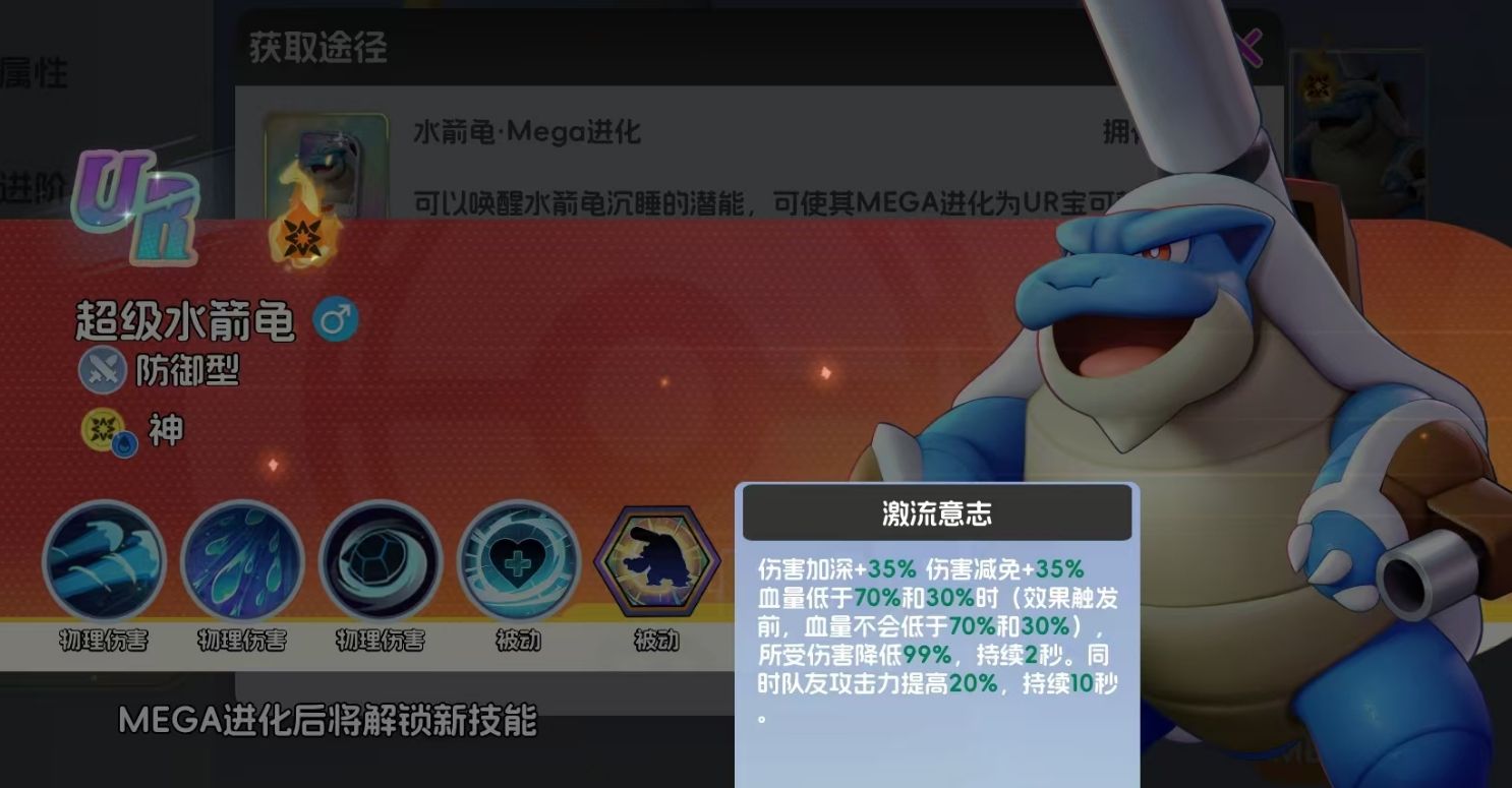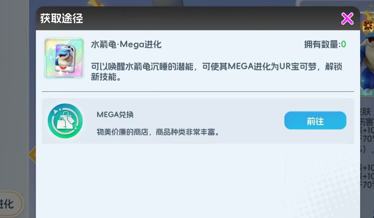 而在完成MEGA进化的升阶要求后,人们还要拿到目标宝可梦的MEGA进化卡,以此来让目标宝可梦实现MEGA进化。进化时只需消耗1张MEGA卡,且完成进化后目标宝可梦的品级会立刻达到UR级。目前各宝可梦的MEGA进化卡都需要在MEGA兑换商店里进行购买,该商店只有在服务器开放时才能前去换购,不同宝可梦所需用到的MEGA进化卡不一样,玩家们在兑换进化卡时千万注意不要弄混。此外,当玩家成功完成目标宝可梦的MEGA进化达到UR级后,还能帮助它解锁一个全新的技能,每一只完成进化的宝可梦都是如此。