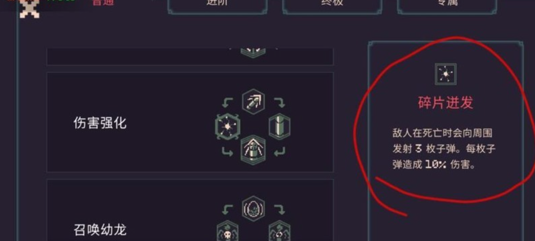 玩家可以直接选择蝙蝠作为武器,因为蝙蝠枪自带自动追踪的功能,而且在战斗的时候不需要瞄准,碰到敌人,还能够连续碰撞两次,所以不管是花火的雷电效果,还是点燃,冰冻等等特效,都能够触发,输出高效。能够满足具体的需求。不过在天赋方面建议玩家要有所讲究,在最初的时候不要直接点召唤,前期先用。怒眸,这个作为基础输出方面的保障,等到了后面的时候再使用燃烧或者是冰冻,建议先拥有基础元素效果,接着再点伤害强化和碎片,一旦敌人死亡之后,会自动射出子弹,这样的话能够有效的提高清怪的能力。