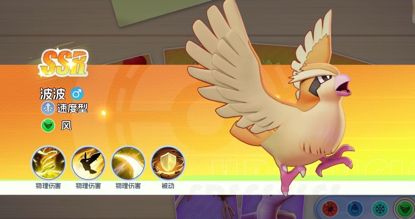 波波在宠物集结里是初始品级为SSR的宝可梦,它的定位为速度型,会在战斗中对敌人造成物理伤害。在1级时就能解锁的大招除了能让波波吹起风暴,令风暴路径上的敌人受到高额的伤害外,还能将它们全部击飞,并施加无法使用技能的封印效果,是一个兼具伤害与控制的技能。当波波达到11级时,它还能解锁自己的第二个技能,令自己能在开局时就飞到敌方后排进行突袭,配合上41级能解锁的空气斩,能让波波爆发极高的连招,快速削减敌方后排的血量。若敌方后排放的是以远程攻击为主的敌人,波波还能享受到被动的加攻效果,进一步提升自己对后排敌人造成的伤害。