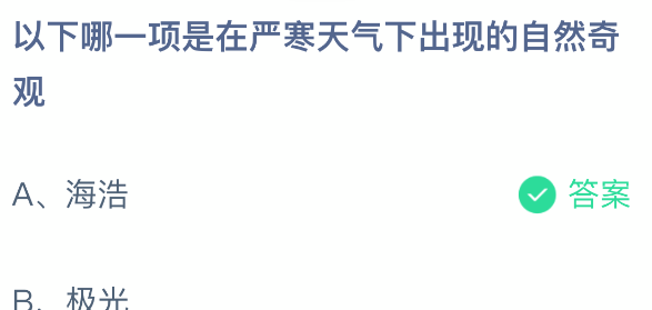 以下哪一项是在严寒天气下出现的自然奇观?支付宝小鸡课堂开课啦!每天花一分钟答题赚饲料,喂喂小鸡就能贡献爱心啦!轻松又意义十足!2026年2月12日蚂蚁庄园的小鸡课堂题目正确答案是【海浩】,海浩是在严寒天气下出现的自然奇观。