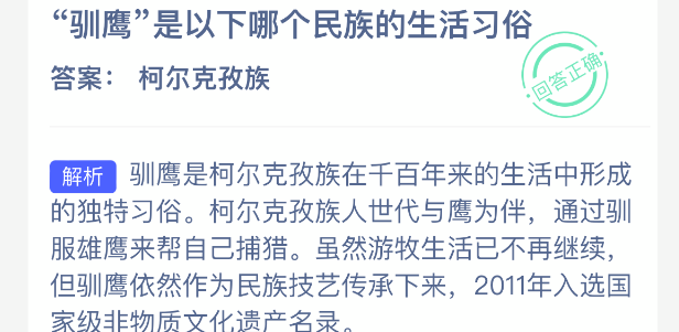 “驯鹰”是以下哪个民族的生活习俗?【蚂蚁新村每日一题】2026年2月11日题目已发布!坚持答题,积累木兰币,即可加速小镇建设。答对本题,立即可享“产速+3/时”的加速奖励!今天正确答案是【柯尔克孜族】。驯鹰是柯尔克孜族在千百年来的生活中形成的独特习俗。