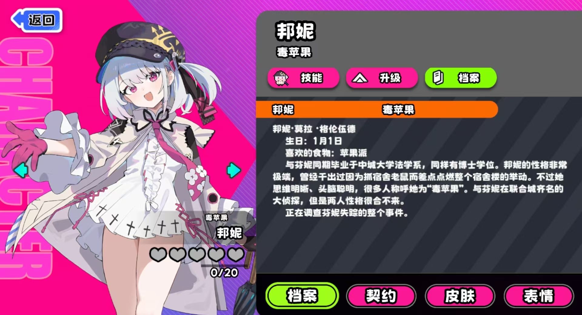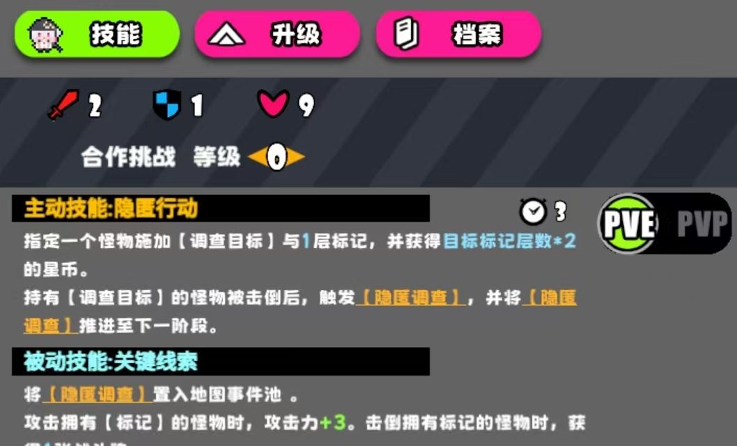 邦妮是一个可通过标记来进行获益的角色,在PVE模式下,她可指定任意非首领怪物并对其施加标记调查目标,每次施展都能获得该怪物调查目标标记乘2的星币。倘若持有标记的怪物被击倒(任意玩家都能触发),还能触发邦妮的隐匿调查效果,重复触发还能推进隐匿调查的阶段。目前隐匿调查共有4个阶段,阶段1时邦妮和事件触发者都会进入无法被挑战的隐匿状态,且能对6格内的非首领怪物施加1层标记,阶段2时会在阶段1的基础上,让邦妮和事件触发者都获得1张战斗牌。若将隐匿调查推进至阶段3,则会在阶段2的基础上对所有非首领施加1层标记。等隐匿调查推进至最终的真相揭露阶段时,首领敌人将会受到2层标记,场上所有玩家都会获得1张战斗牌,并进入隐匿。