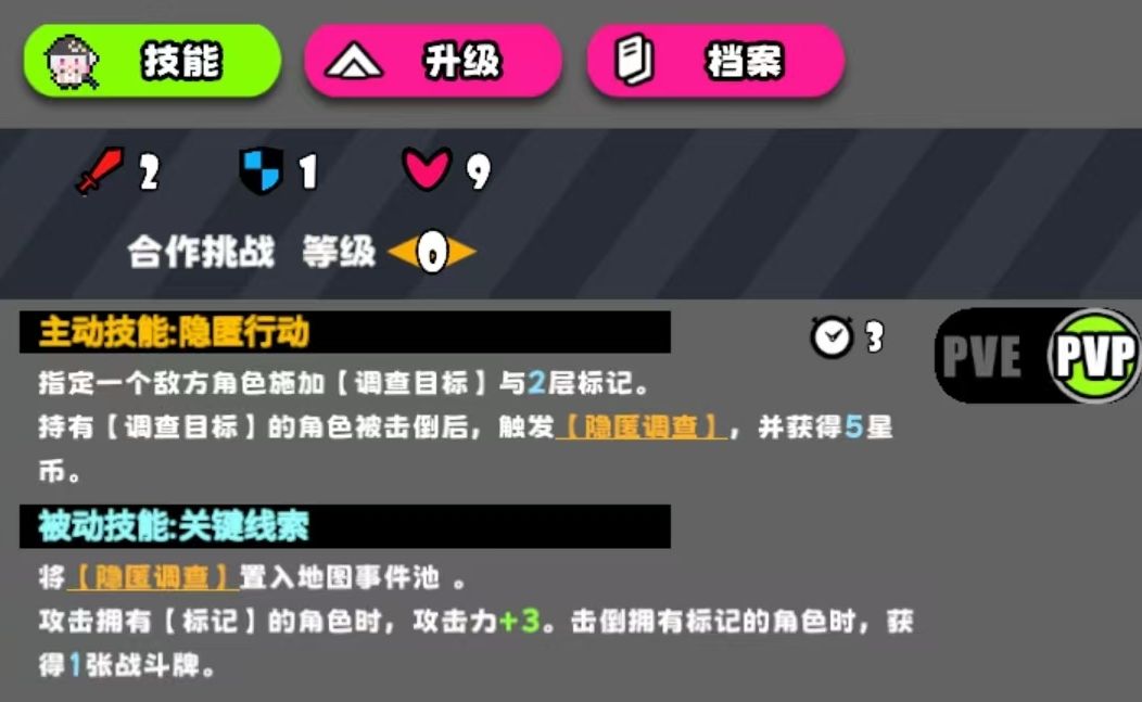 而在PVP模式里,邦妮同样可施加标记,只是施加对象从怪物更改为了其他玩家,隐匿调查也将不会拥有多个阶段,但会在邦妮击倒拥有标记的玩家后,为全体玩家都挂上2层标记,且邦妮自身能额外获得5星币的收益。同样的,邦妮攻击有标记的玩家时,一样能像PVE那样享受攻击3、击倒额外获得一张战斗牌的效果。所以,邦妮在PVP里的玩法也很直观,那就是尽可能地击败有标记的玩家,争取为所有人都挂上较高层数的标记。