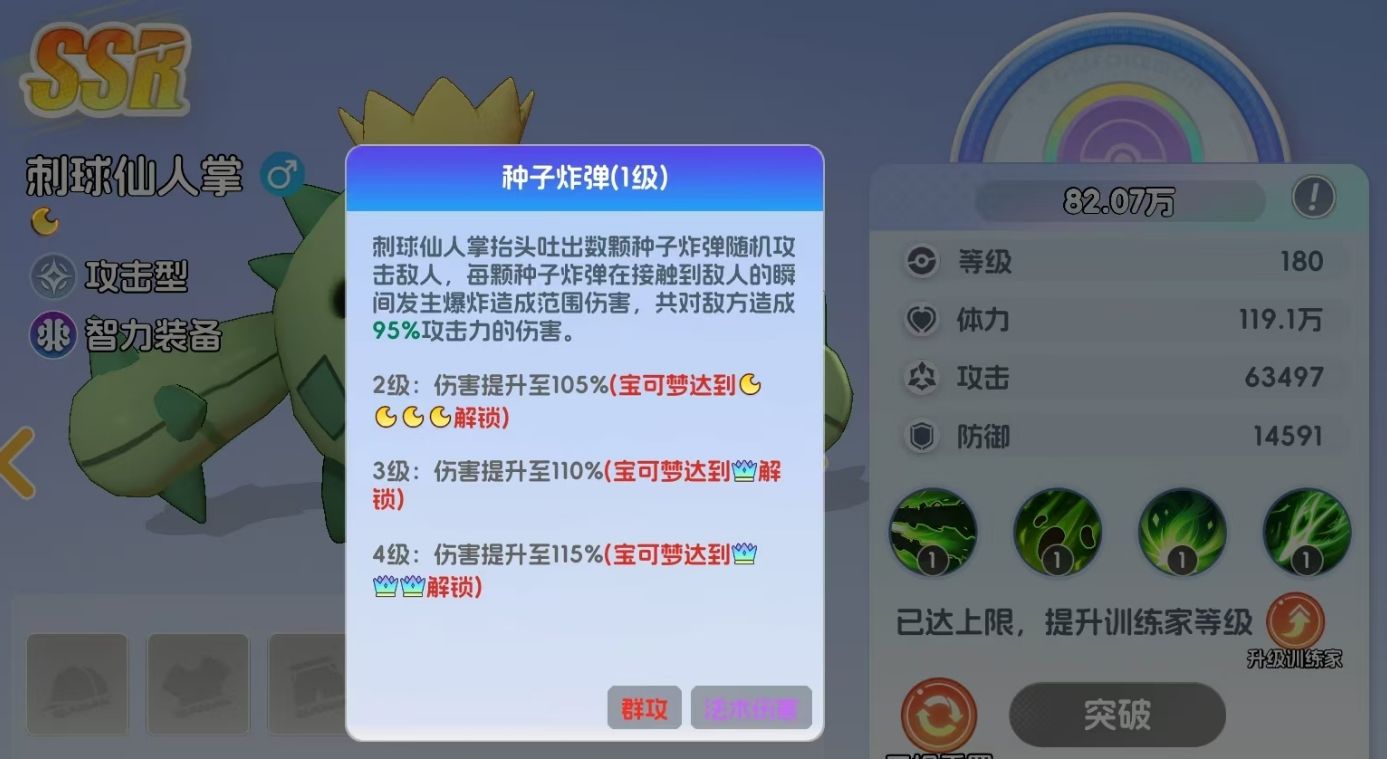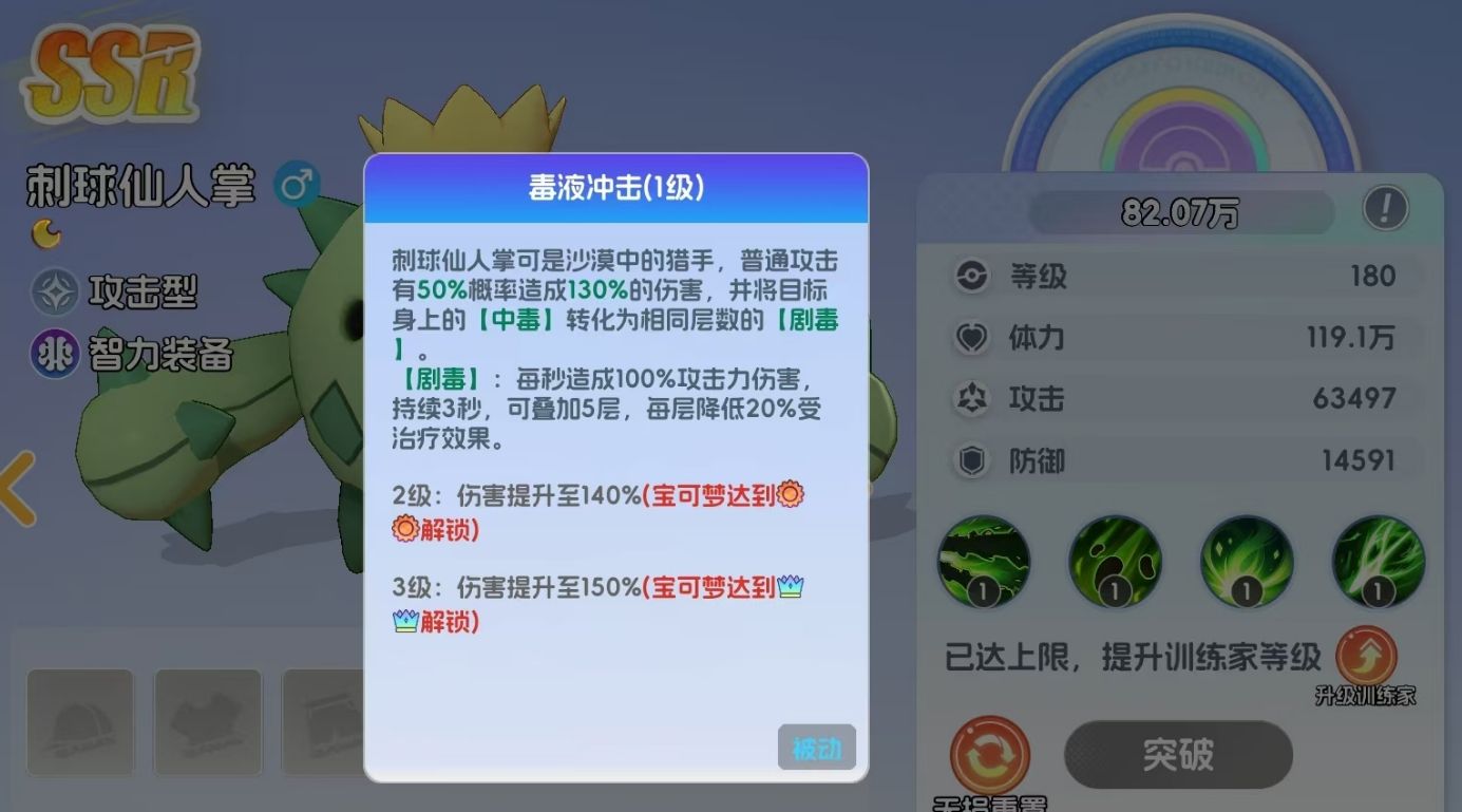刺球仙人掌是SSR级攻击型宝可梦,隶属于风阵营,其攻击以对敌人造成法术伤害为主,且能通过多重手段为敌人施加中毒效果。释放终结技时,刺球仙人掌会向敌人喷射出毒刺,随机攻击处于自己面前的敌人,并对它们施加中毒效果。每道毒刺所造成的中毒效果都会独立计算,敌人每被毒刺攻击到一次,都会被叠加一层中毒,最多能叠加五层。受到中毒效果影响的敌人不光会受到基于刺球仙人掌攻击力的持续伤害,还会根据中毒层数降低自己所受到的治疗效果,每层降低10%,能变相削弱敌人的持续作战能力。
