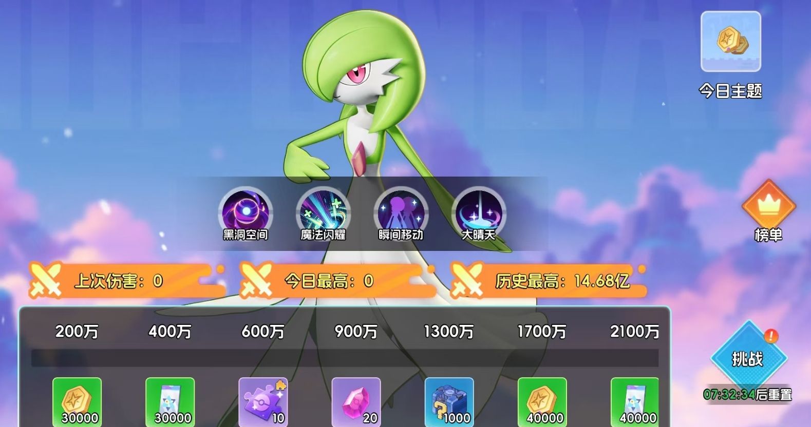 要想解锁每日挑战,玩家们需要先通过探索关卡5-32,然后在岛屿里完成冒险奇谭(简称飞艇)的建造,才能在飞艇里参与此玩法。它的规则很简单,玩家们需要挑战当天的宝可梦boss,并根据所打出的伤害来获取奖励。其中,最低一档的奖励需要玩家打出200万伤害,封顶伤害为5000兆,但很难到达。游戏会在该玩法里设置7个会在固定时间开启的主题,并按顺序进行轮换,不同主题下玩家所面对的宝可梦boss也不一样,各宝可梦boss所携带的奖励也不同。挑战时间为当天0点至晚上23点30分,结束后会进入结算环节,并为玩家发放当天的挑战奖励。