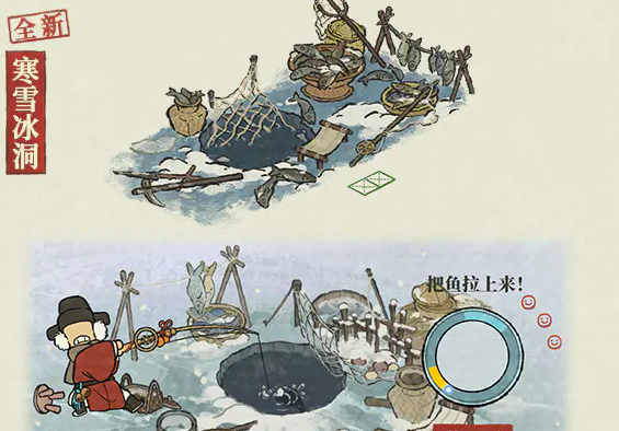 开放的全新区域——冰湖,将承载多项限定玩法。其中,“冰钓”作为重点小游戏正式上线:玩家需先建造“饵料小屋”,消耗基础材料即可产出鱼饵原料;随后建造“寒雪冰洞”,在完成建筑并备齐鱼饵后,即可开启冰面垂钓。所获鱼类除可出售换取资源外,还将自动录入图鉴系统;集齐全部图鉴后,可兑换储鱼冰屋、大鱼祈愿像、冰鱼雕像等稀有奖励。