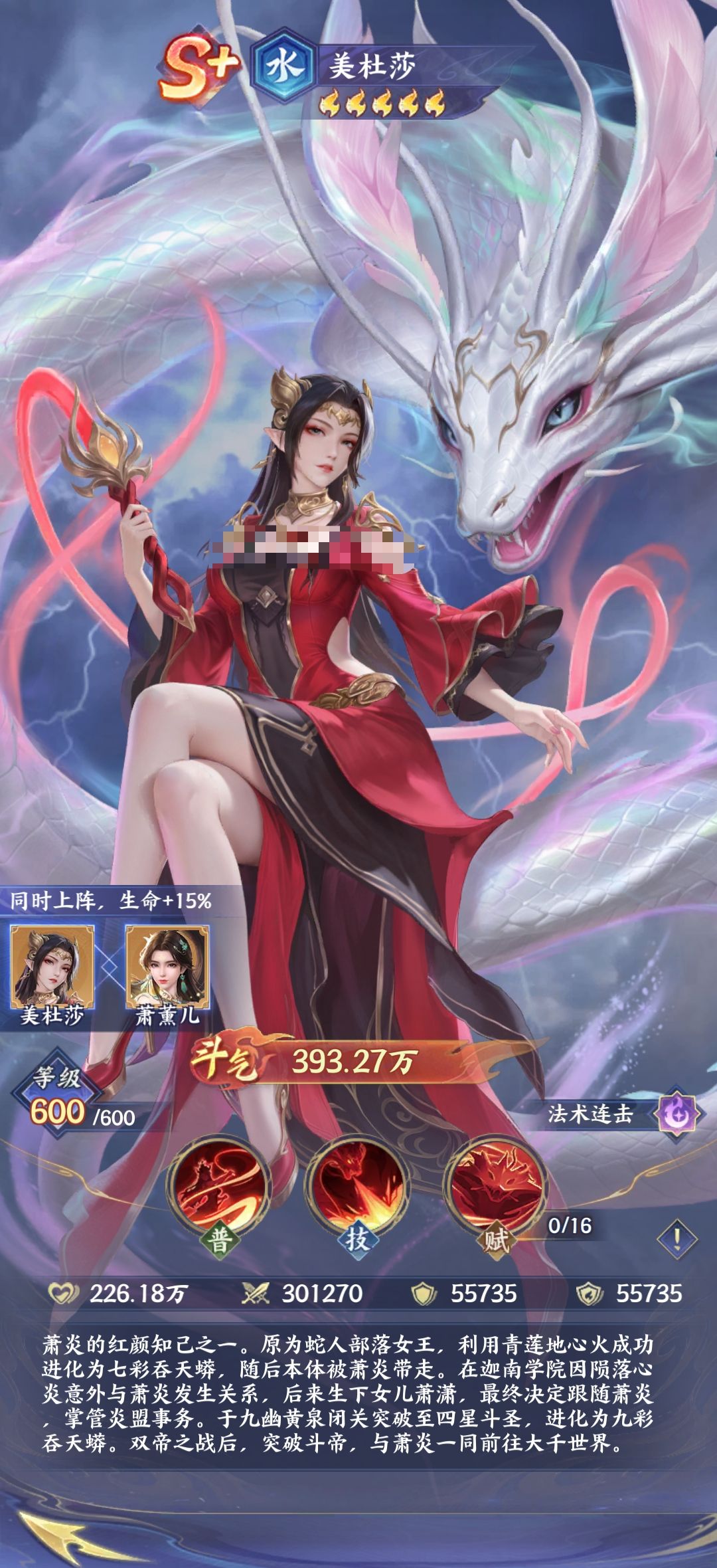 不得不说美杜莎的角色魅力也是比较强大的,而玩家如果合理的运用美杜莎之后,她其实也能够发挥着重要的作用。她作为橙卡具备广泛性,一旦搭配萧炎,萧薰儿直接组成双核爆发的阵容,这时候实力比较强悍。