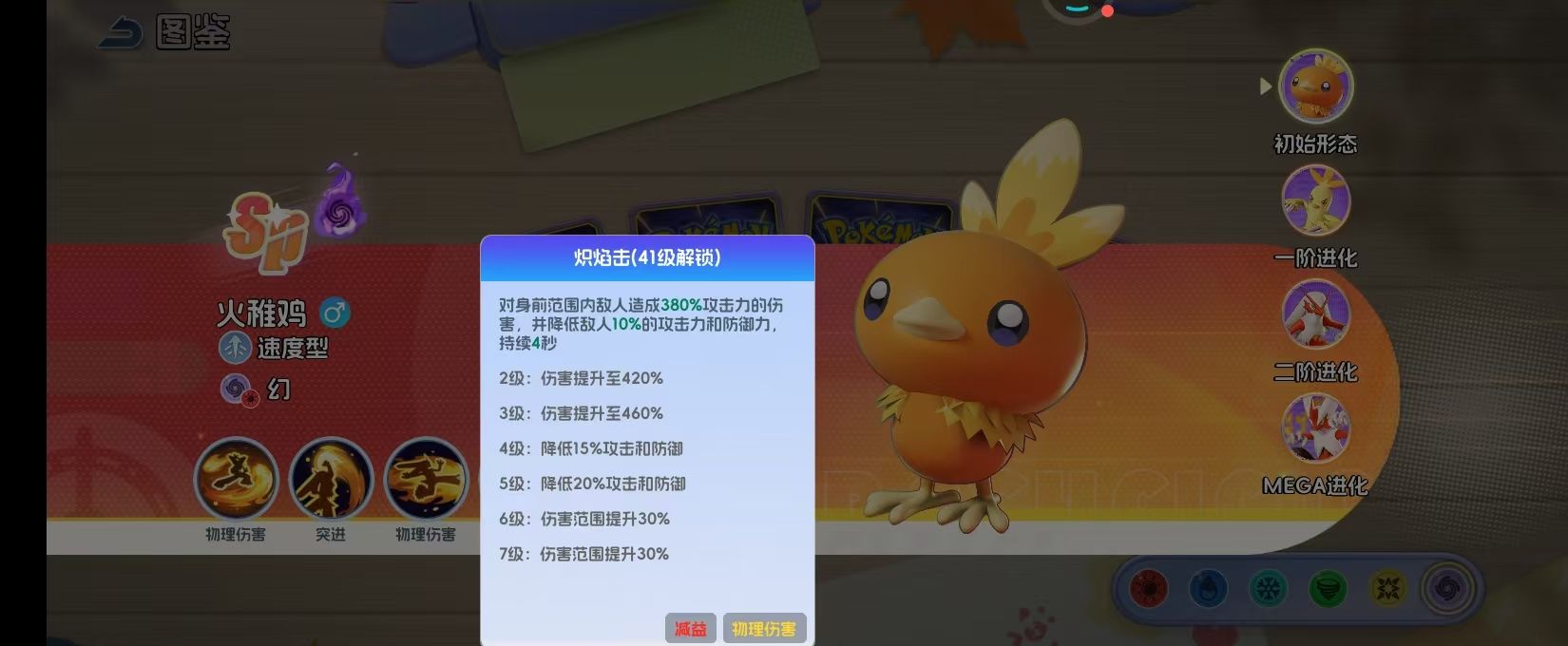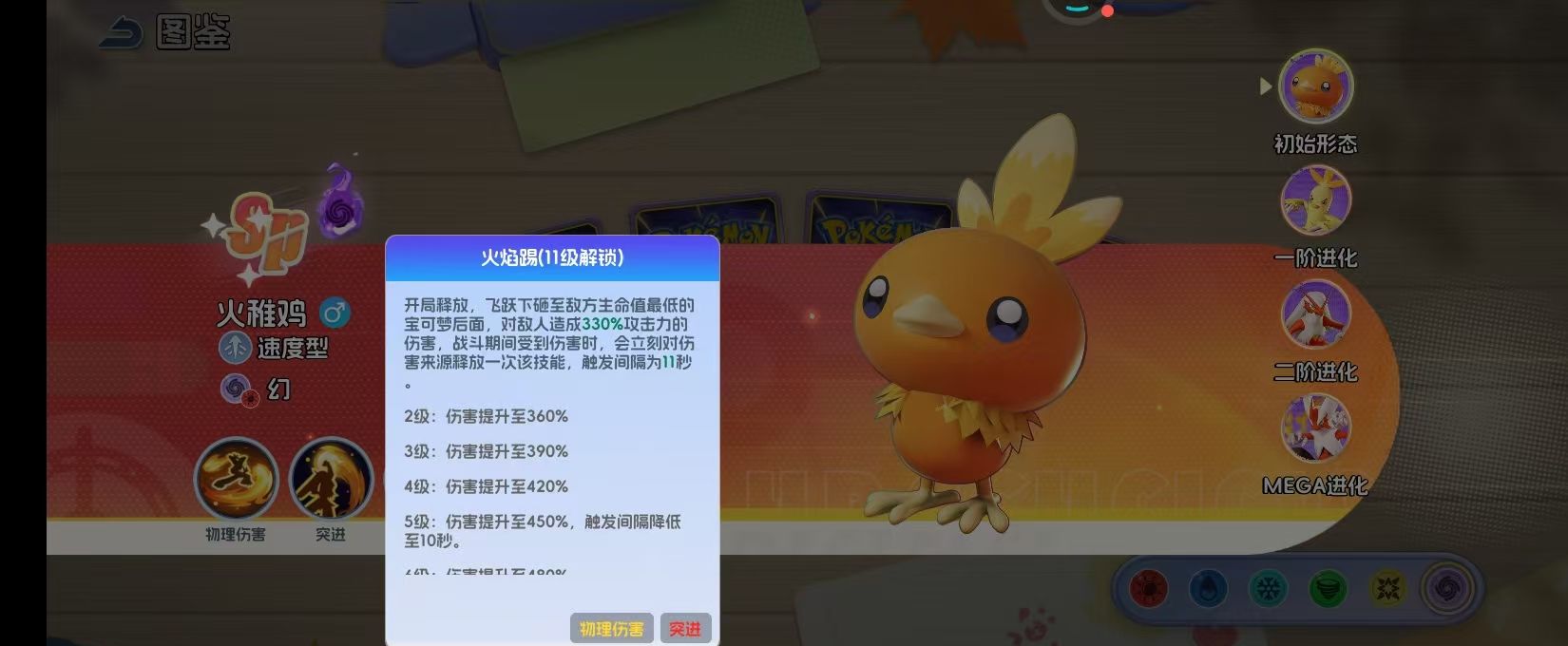 火焰踢这是等级11级之后就可以解锁的技能,核心的机制就在于拥有针对性。在开局释放时,他就直接会跳到敌方生命值最低的宝可梦身后,就可以造成330%的攻击力伤害,这种精准的斩杀设计就可以让他直接成为敌方后排的噩梦。战斗期间如果他受到伤害,那就会对伤害来源直接释放一次技能,触发间隔初始是11秒伴随着技能等级提升就可以直接缩短到10秒。这一个机制在对手集火攻击时,那自然就会有效果。
