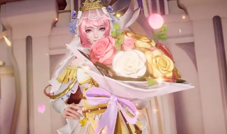 1、品质定位:大乔沐霞之诺皮肤是限定皮肤,整体以白金为底色,层叠设计的短款婚纱,梦幻优雅。粉色披肩长发,搭配镂空皇冠与轻盈头纱,气质温柔。缀以金色荆棘,突显华美格调。武器化作手中三色交织的捧花,与霞光交相映衬。