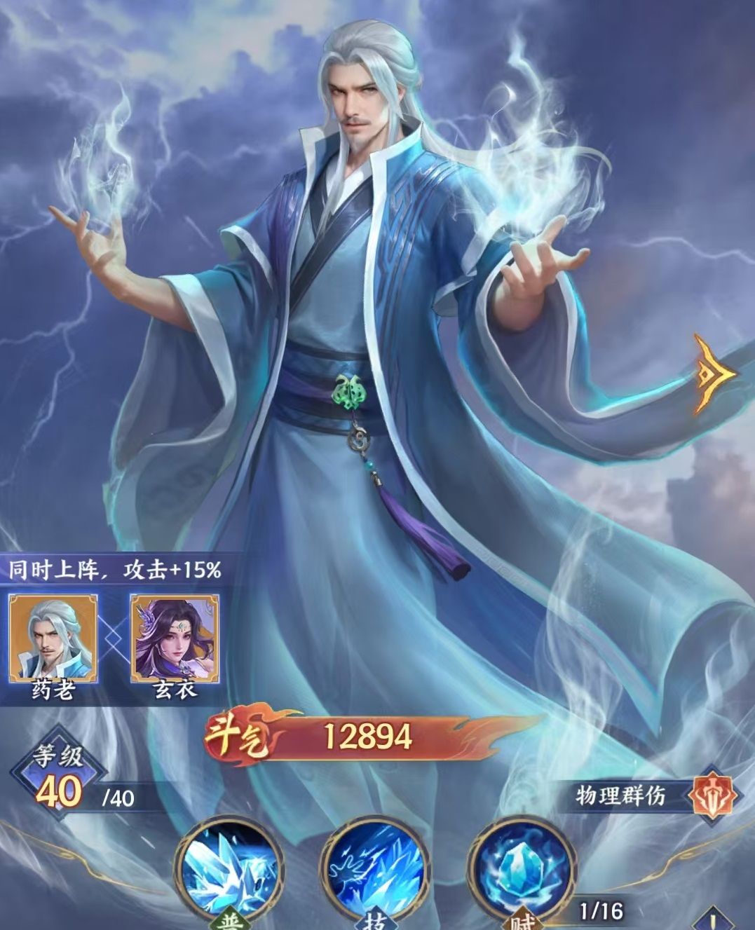 药老属于物理群攻型主C,不设普通攻击,每次行动必释放技能“骨灵寒幽”。该技能需消耗全部怒气值,对敌方全体造成高额伤害;若怒气值超过2点,伤害随怒气总量线性提升。技能释放后,自身将进入持续两回合的虚弱状态。升星后解锁进阶效果:若技能击杀敌方单位,则虚弱时长减少1回合;同时对生命值高于80%的目标额外提升伤害。在羁绊协同方面,与玄衣共同上阵可使药老攻击力提升15%,显著强化其爆发稳定性。