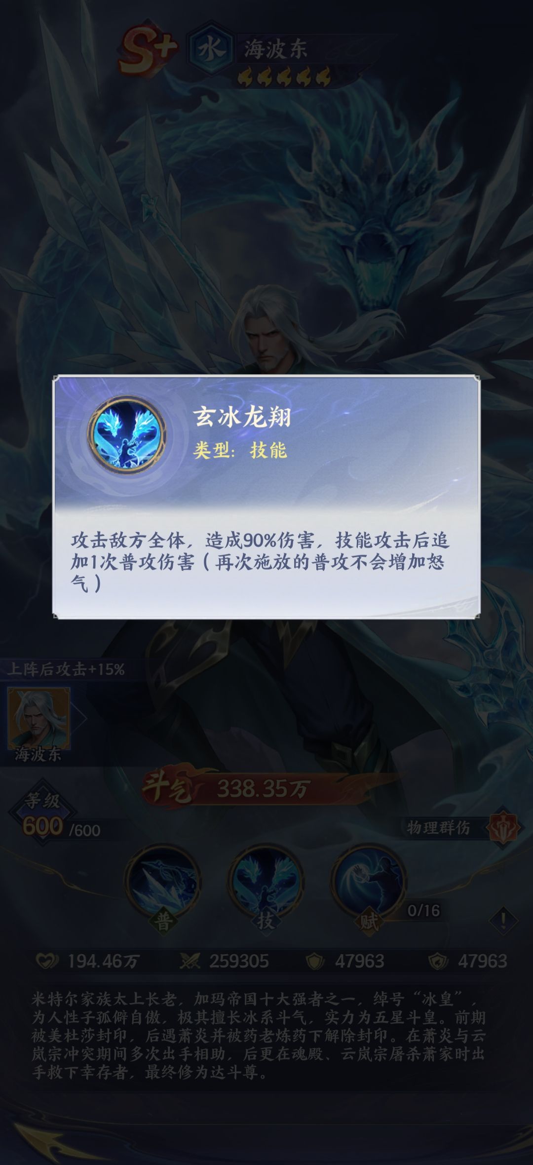 海波东在原著当中被称之为冰皇,其实他的实力比较强悍,作为S加级别的水属性,物理纯伤类型的斗者。对于玩家来说,他如果施展他的招牌技能也就是玄冰龙翔,一旦释放之后,将会对敌人的全体造成高额的伤害,并且这个技能攻击之后还会追加一次普通攻击伤害,简单来说,也就是在一回合以内就能够给敌人的全体造成了两次攻击伤害,在这样的情况下能够有效的达到清场的目的。其实更重要的是,他的这次普通攻击技能不会增加怒气值,但是能够让他更快的释放大招,这样的话就会形成持续性的压制,能够让全体的实力上升。