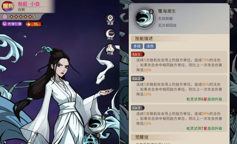 白蛇的主动技能叫覆海潮生,可以对敌方随机造成5次攻击。每段攻击基础伤害是99%,5段加起来就是495%伤害。虽然命中同一个目标伤害会降低15%,但这种多段攻击机制在实战中其实挺灵活的。而且主动技能7星就能点满,相比其他耀辉角色要14星才满级,白蛇在养成成本上确实友好很多,前期就能把技能拉满。