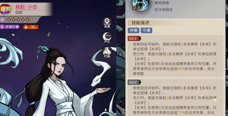 第二个被动渡劫之志,才是白蛇真正的核心优势。首先能保命,受到致命伤害不会直接死,还能回血清负面状态。这点大大提升了生存能力和反打空间,就算被集火也有翻盘机会。其次就是输出机制了,队友每次行动后,有40%几率,给白蛇叠一层骨钗。叠到5层10层15层的时候,就能释放水漫金山打全体aoe伤害。15层的伤害倍率,有700%法伤,配合队友高频率行动,能快速叠层释放多次aoe。