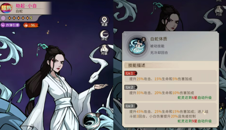 被动技能白蛇体质,有个很实用的免控效果。9星以后,前3回合可以免疫控制,这点在pvp和高难度副本里帮助很大。很多队伍都是靠前期控制建立优势,白蛜有了这个免控就能稳稳站住前期,不会被对面直接控死。虽然只有前3回合,但通常前3回合才是最重要的时候。