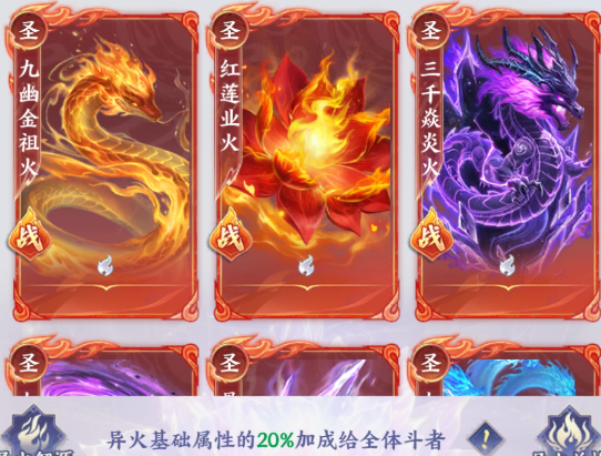 另外,在限时活动中,玩家就能有机会获得一些顶级的异火,三千焱炎火、净莲妖火这些主要是通过限时运营活动产出,建议大家关注游戏内的节日庆典,还有版本更新。能有机会把这些传说之火全部收入囊中。进入到商店中,使用特定的材料去兑换,也能有机会获得自己所喜欢的异火,优先去兑换当前阵容所需要的。此外还可以去参与焚天古灵殿等一系列秘境副本,只要把Boss打败,就能有机会获得异火核心碎片。