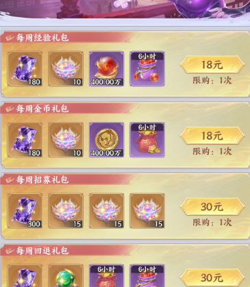 主要的获取途径就是通过礼包商城,其中每一周回退的礼包,那就是获取的重要方式,每周回馈礼包售价30元,限购三次,每一次都可以获得一个,另外还可以获得两个6小时资源袋还有300紫晶,对于需要频繁进行资源回溯的玩家而言,那购买每周的回馈礼包就是一种比较划算的方式。这种玩法对于玩家而言,在培养的过程中就会比较自由,大家可以大胆的去尝试培养不一样的角色。就算后期发现不合适,也可以重新的调整。