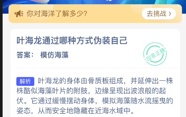 以上就是叶海龙通过哪种方式伪装自己?神奇海洋今天答案最新2026年2月25日分享,更多相关攻略内容,请点击关注更新!