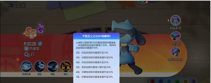 不屈正义之心这就是被动技能,这早就已经成为战场韧性的源泉。在61级解锁之后,上场马上就能拿到15%的伤害加深,还有15%的伤害减免。同时自身还会减少20%的远程伤害。针对近战目标的伤害就可以提升百分10,伴随着技能等级的提升,这些效果就会持续的加强。7级时伤害加深,还有减免可以提升到30%远程伤害就可以提升到30%,这个被动技能让他在面对远程消耗时就会拥有更好的优势。作为一个防御型的宝可梦,他的技能组合就会拥有输出,控制,还有辅助等一系列优势。