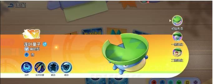 莲叶童子一开始头顶会有一片翠绿的叶子,但是此时就能够展现出辅助的天赋。作为一个拥有雨属性的辅助型精灵,他的技能早就已经点亮法术伤害还有治疗,两个被动技能可以给后续的进阶直接埋下伏笔。此时的他就好像是刚刚进入到战场的新手,虽然没有具备强大的辅助能力,但是却用基础的治疗技能给所有的队员续航始终都会承担着守护的作用。