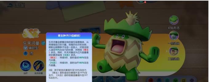 在最后进阶之后就会变成乐天河童 ,这就是一个全能辅助的终极形态。此时头上的帽子就出现了变化,作为一个二阶进化的形态。他的辅助能力就会进入到巅峰的状态,尤其是11级解锁的核心技能,就会让他在团队中成为一个无可替代的存在。这一个技能就可以让他的嘴巴直接变成机关枪,一下子就可以喷射出好几颗种子,然后攻击敌人,不仅可以造成高额的法术伤害,同时还会拥有寄生的状态,可以持续针对敌人去造成伤害。能达到持续治疗队友的作用,在团战的过程中是拥有多重优势的,难怪被称之为全能辅助大师。