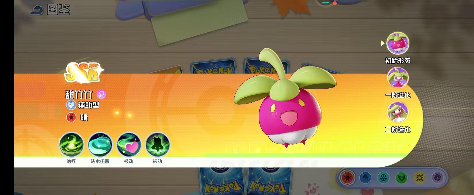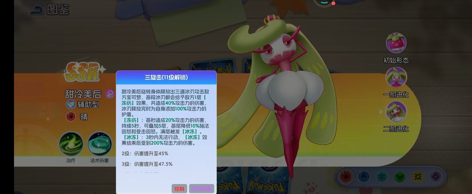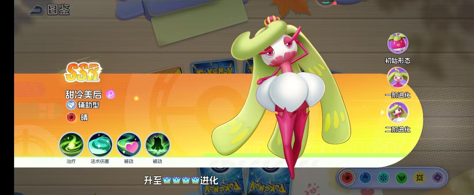 到了后期就会进阶成甜舞妮。这个时候就会没有一开始的稚气,而是拥有绿色的长发。开始会学习用一些具有攻击性的方式去保护自己或者是队友。每一次的攻击都会拥有热带阳光的灼热,每一次的旋转都好像是花瓣一样的优雅,并不再是躲在队友背后的那一个小果子,而是成为了一个舞者,能够独当一面。在无数次的战斗中都可以磨砺出坚韧的意志,最后就可以通过进化变成甜冷美后。