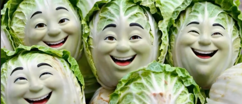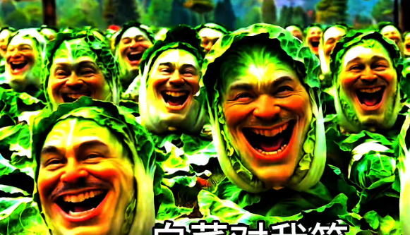 AI白菜梗图:用AI生成各种带笑脸的白菜,配上夸张表情和背景音乐,画面和声音的反差感拉满