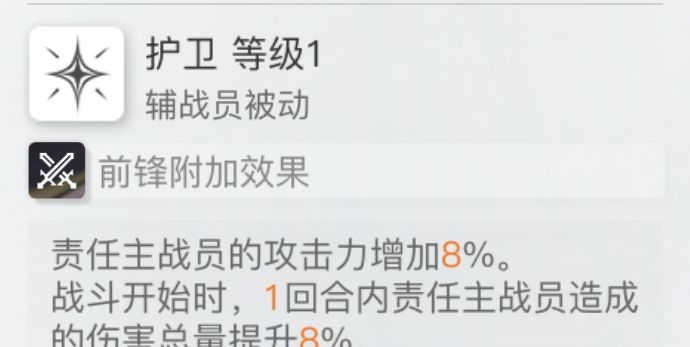 三星熊道格拉斯拥有主动和被动两个技能。他的被动技能名叫护卫,可以使穿戴者获得8%的攻击力提升。此技能还能够在战斗开始时使得责任主战员所造成的伤害总量提升8%,是一个十分万金油的增伤型技能。配合能够强力输出的主c,能够在游戏开局就对敌人造成可观的伤害。玩家们也可以耗费两点EP来使用他的主动技能巨型火箭筒,实现120%的伤害增幅。值得注意的是,这个技能是整体增益,使用后可以对全体敌人造成伤害提升。玩家们使用该技能来配合责任主战员的话,可以造成一回合内的大范围伤害,不论是清杂还是挑战boss都会很好用。