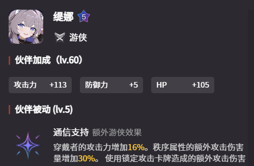 除了主战员,辅战员中也有一些角色能够提供额外攻击的伤害增幅。比如缇娜,她作为一个五星辅战员,其被动“通信支持”不仅可以使穿戴者增加16%的攻击力,还能使秩序属性的角色提升30%的额外攻击伤害量。此外,她还可以让锁定攻击卡牌所造成的额外攻击伤害量提升50%,可以说是十分适配雨果的属性和技能组。将他们两个搭配在一起可以让队伍的输出获得质的提升。