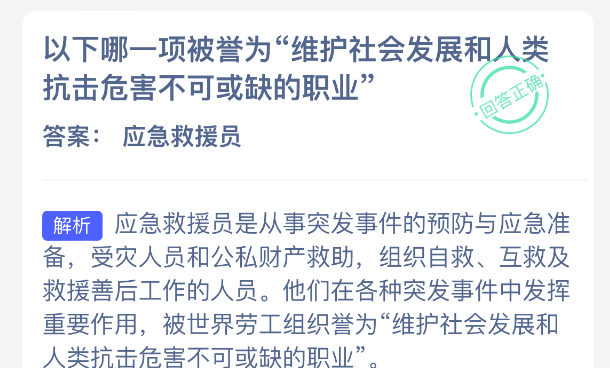 以下哪一项被誉为“维护社会发展和人类抗击危害不可或缺的职业”?【蚂蚁新村每日一题】2026年2月28日题目已发布!坚持答题,积累木兰币,即可加速小镇建设。答对本题,立即可享“产速+3/时”的加速奖励!今天正确答案是【应急救援员】。应急救援员被誉为“维护社会发展和人类抗击危害不可或缺的职业”。