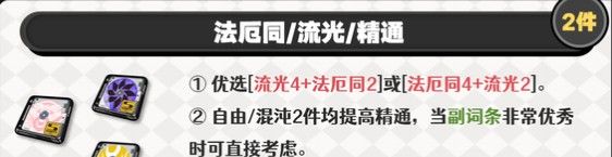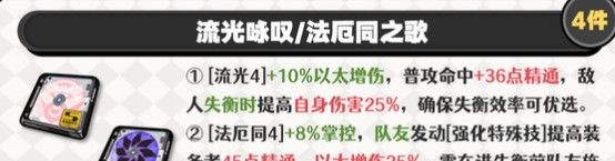 二件套的选择上,需要根据四件套的驱动盘进行考虑,在选择【法厄同之歌】时,可选择【自由蓝调】这类提供异常精通的驱动盘,选择【流光咏叹】时,则需要选择【法厄同之歌】提供异常掌控来提高【异放】伤害加成比例