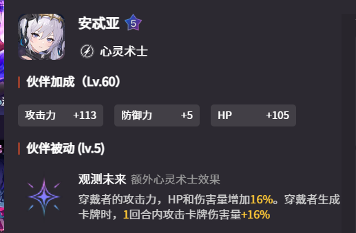 德蕾莎的辅战员选择以增伤属性为主,最好的是安忒亚。安忒亚的被动能够使穿戴者的攻击力、hp和伤害增加16%,并且使觉得生成的攻击卡牌伤害量在一回合内提升16%,十分契合德蕾莎高频生产匕首卡的特性,能够大幅度的提升她的战斗力。而德蕾莎的队友选择则需要注重是否可以提供额外行动点和提升过牌能力,当前版本拥有高额恢复能力的米卡则是她的理想搭档。能够跟随队友进行额外攻击的雨果也能与其形成搭配,一同实现高频多段的高输出。