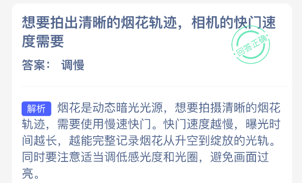 以上就是要拍出清晰的烟花轨迹,相机的快门速度需要?支付宝蚂蚁庄园2026年3月2日答案最新,更多相关攻略,请关注3dm手游网更新!