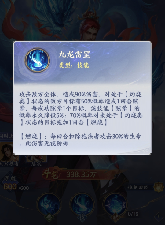 九龙雷罡其实就是唐震的最强功能的一个技能效果,想要发挥唐震的最大潜力就要用到,这个技能释放的时候,能对全体敌人施加灼烧状态,重点是哪怕敌方没有被灼烧,也能强制触发,相当于开局就能给敌方全员挂 debuff,同时还能附加眩晕效果,打断敌方的开局技能释放,这一点真的太关键了,尤其是面对那些开局就放爆发技能的敌方阵容,唐震开局一个九龙雷罡,就能直接打破前期对面的节奏,而且后续每次命中处于灼烧状态的单位时,唐震自身的斗气积攒效率还会提升,所以这个时期斗气攒得快,就能更频繁地释放技能,还有一点大家一定要注意,这个技能没有防御减免机制,伤害结算不是看敌方的防御,而是基于目标当前的攻击力,所以哪怕面对高防阵容,唐震也能打出稳定的压制力,不会出现打不动的情况,这也是他比其他火系角色更实用的地方。