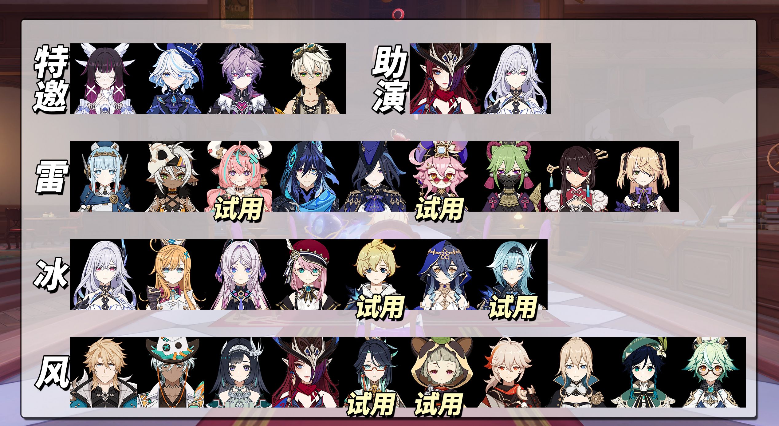 冰:丝柯克、爱可菲、茜特菈莉、夏洛蒂、米卡(试用)、莱依拉、优菈(试用);
