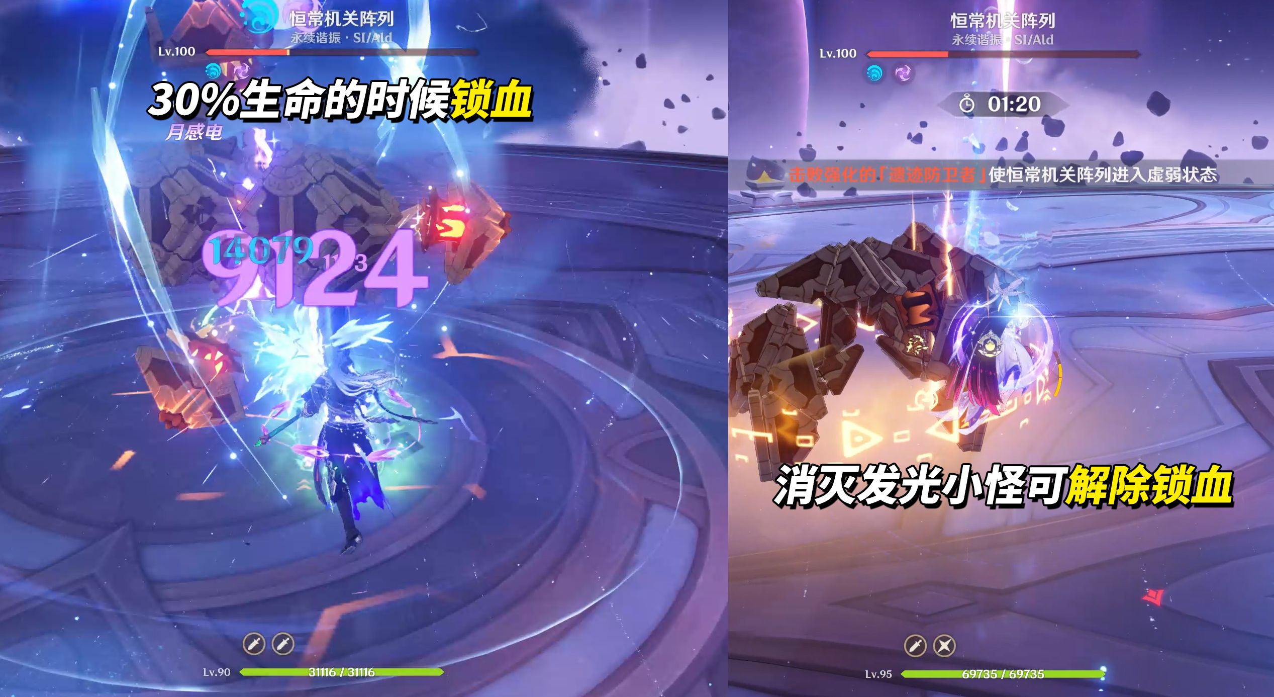 第10幕恒常机关阵列,手中剩余角色组最强队伍处理即可,仅需记住它30%血量锁血,此刻停手观察,消灭发光小怪后才可接触本体锁定,避免浪费技能。