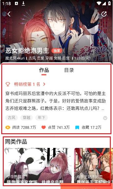 6、在详情页,能查阅作品的详细介绍、目录详情,还能浏览同类作品推荐,也可将该漫画加入收藏。
