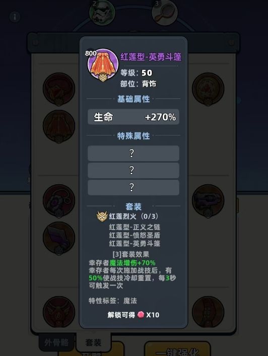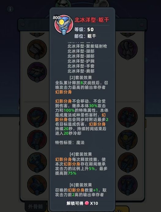 而在其它搭配上,可用北冰洋六件套和擎天型二件套作为外骨骼的外圈配装,擎天型二件套可让玩家获得能量块,以此获得高倍率的物理增伤,北冰洋六件套的幻影分身效果,可有效地强化幸存者的输出,对主打物理或神圣伤害的幸存者能带来极大的提升,与天际砖头无比适配。至于内圈更适合用红莲型三件套,它有50%的概率在幸存者释放战技后立刻重置冷却,且每3秒就触发一次,让幸存者能更频繁地打出物理或神圣伤害,从而更快地完成激发天际砖头所需的前置条件。
