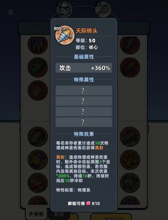 但要知道,天际砖头是最低品质为橙品的外骨骼核心,所以它在前期无法获得,只有将秘境试炼通关至61层后,才能解锁天际砖头的掉落。因此,在外骨骼核心的选择上也分为两个不同的阶段,若玩家们的主力幸存者主打物理或神圣伤害,那边便可在秘境试炼61层之前,使用任意高数值的核心来过渡,等自己能打过秘境试炼61层并获得天际砖头,只用天际砖头作为自己在外骨骼核心上的唯一选择。
