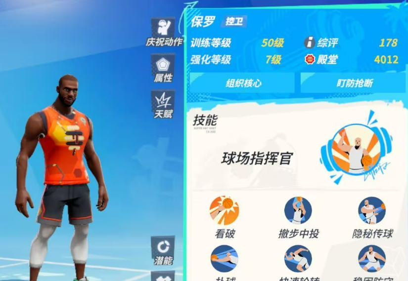 技能这边值得说一下。撤步中投是保罗的主要得分手段,向后撤步直接出手,受干扰的范围变小,出手时机选好了很难防。隐秘传球是他的核心技能,传球速度和安全距离都有加成,而且他抢断的时候,或者是捡到地板球后,在三秒内,下一次传球,就会进入到强化状态,速度变的更快,触发秒传之概率会大幅增加,扣将流打法里这个技能非常主要。扑球是保罗独有的技能,球变成自由球状态时可以直接向前扑过去抢,能抢到比较远的地板球,这个技能目前游戏里只有他有,实战里挺有区分度的。快速轮转是移动技能,无球时位移距离加长,加速期间接到传球后运球移动速度明显提升。稳固防守是防守技能,碰撞体积变大,跟对方球员发生碰撞时会让对方进入被看破状态。