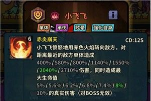 点评:优势是对高血量敌方单位有一定克制作用,真实伤害可忽略防御;短板是对BOSS无效,且小飞飞作为坦克,输出并非核心,技能象征意义大于实际作用,CD较长也影响实用性。