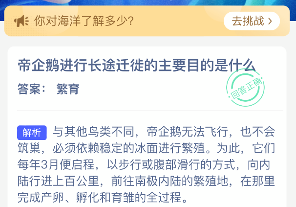 帝企鹅进行长途迁徙的主要目的是什么?【神奇海洋】2026年3月5日新题目已开答!正确答案现已公布,点击领取拼图,一起为修复海洋生态贡献力量!今日正确答案是:【繁育】。帝企鹅进行长途迁徙的主要目的是繁育。