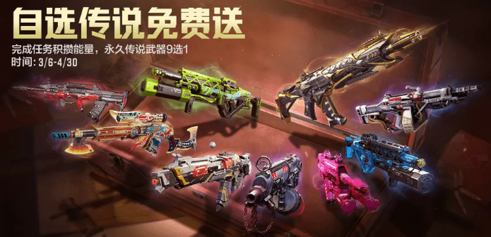 自选传说免费送,是这次活动里含金量比较高的一个,三月六号开始,总共有九把传说武器可以自选。规则是每周完成对局积累能量,集满十六点能量,就能兑换一把永久传说武器,每周最多能收集四点能量,也可以先领三天体验卡。算下来最快四周就能拿到传说武器,另外每周首次分享活动,还有传说武器体验自选宝箱可以领,这个别忘了顺手做掉。