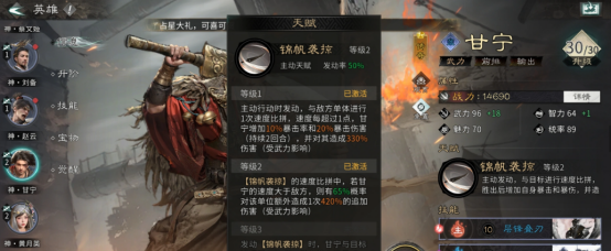 暴击流由多个武将角色组合而成,形成相当强势的伤害输出,那么首先第1个主c位置那就是甘宁,在游戏当中担任着非常重要的作用,主要的核心特色就是速度比拼,有一定的几率能够提高全队的速度,还能够提升队友的属性,比如黄月英的技巧3选1属性能够大幅度增加,稳定敌方的大量移速,还能够扰乱敌方的节奏。将此角色与黄月英以及诸葛亮结合而成,两位角色结合到一起,拥有羁绊效果,尤其是觉醒技能,治疗效果直接拉满,还能够降低buff的稳定,为甘宁提供良好的输出环境。